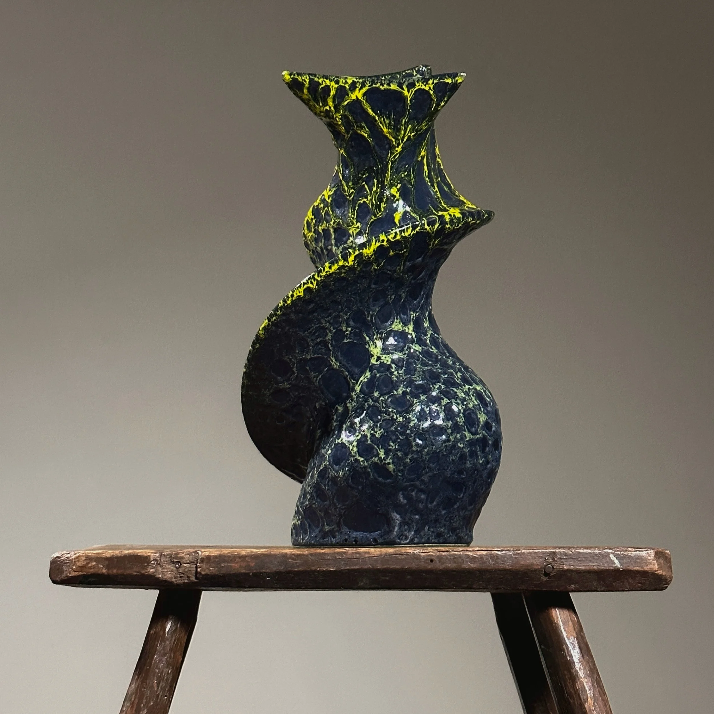 Vintage Postmodern Glossy Lava Glaze Twisted Vase. Dark blue textured. vase with a neon greenish yellow lava glaze. In very good condition with wear consistent with age. No signature found.