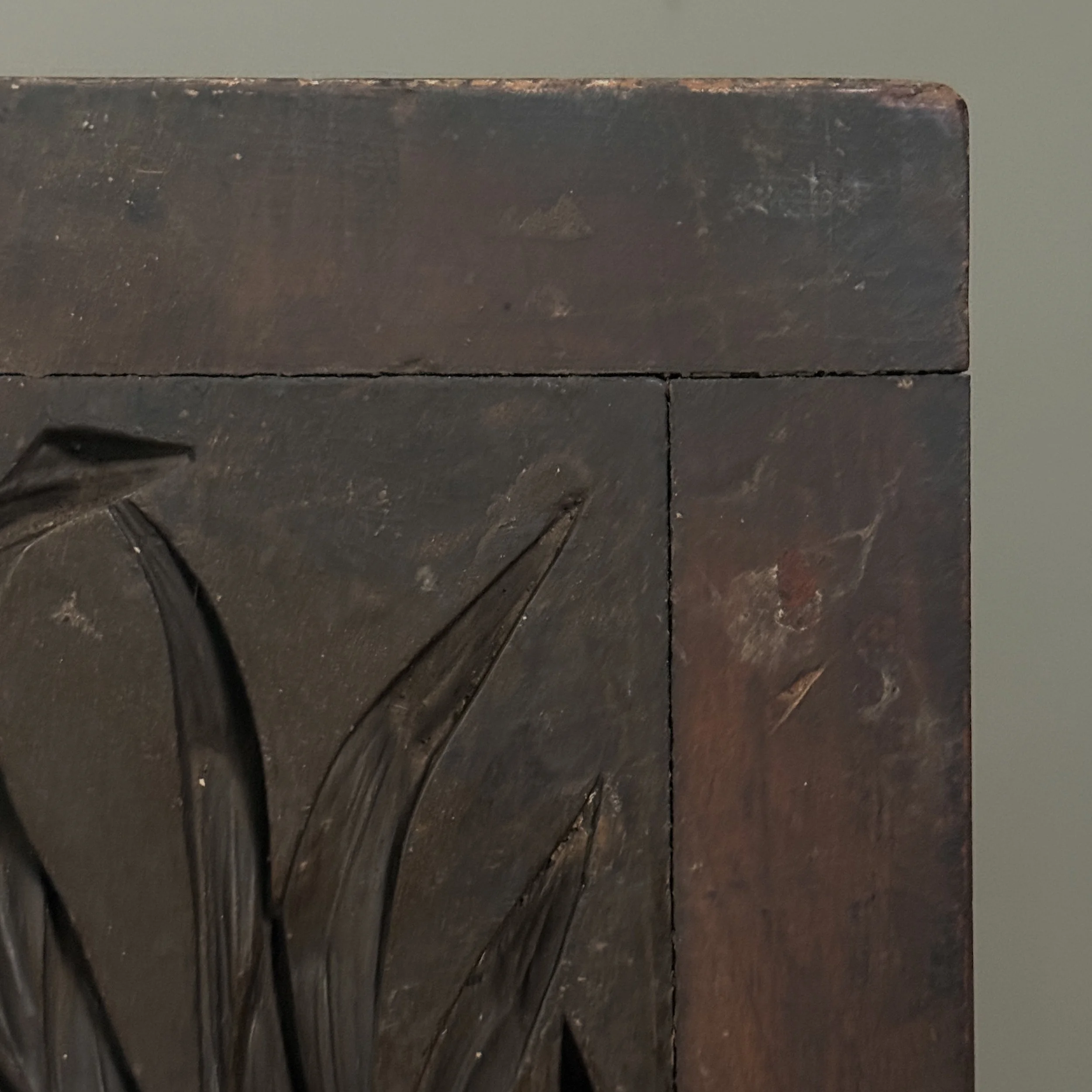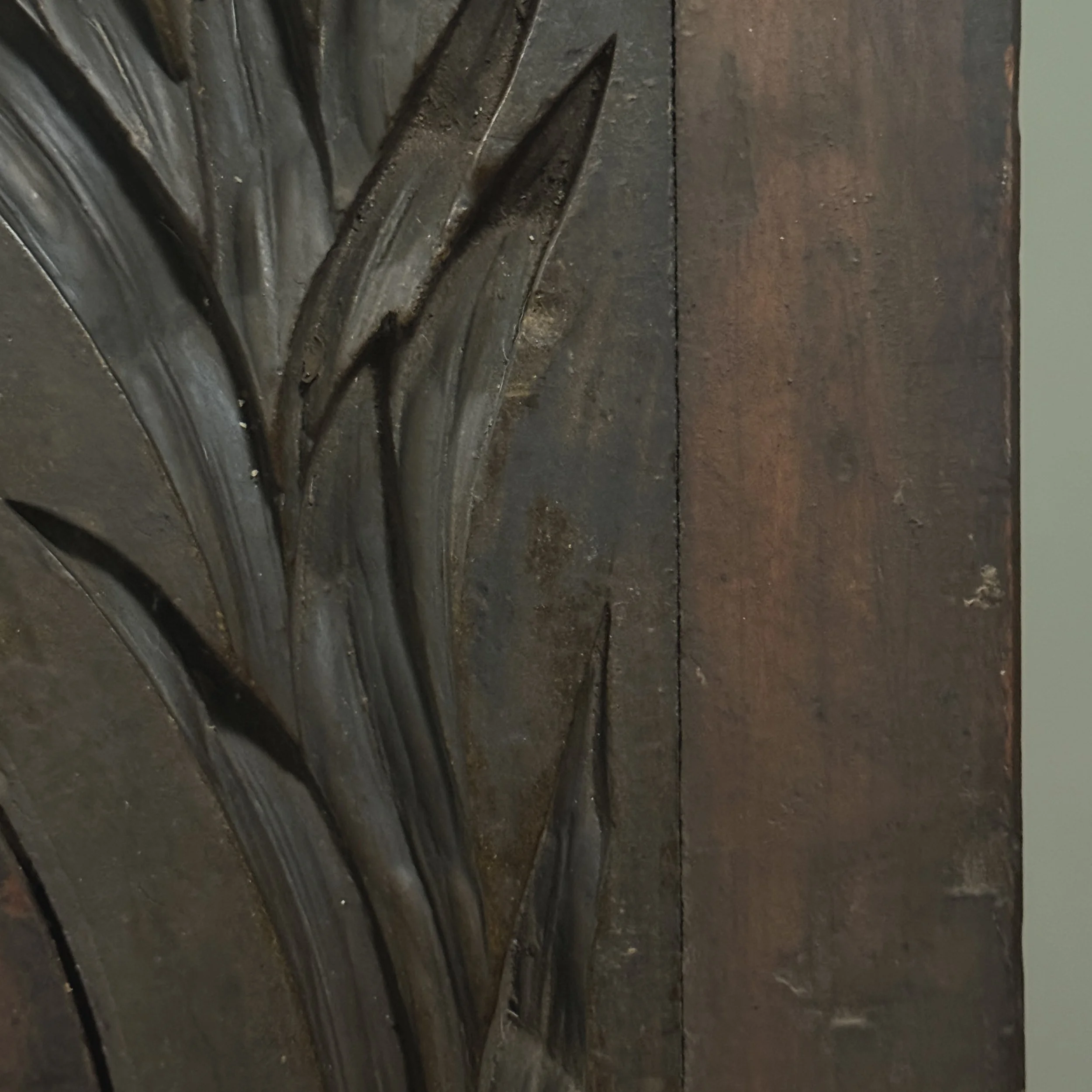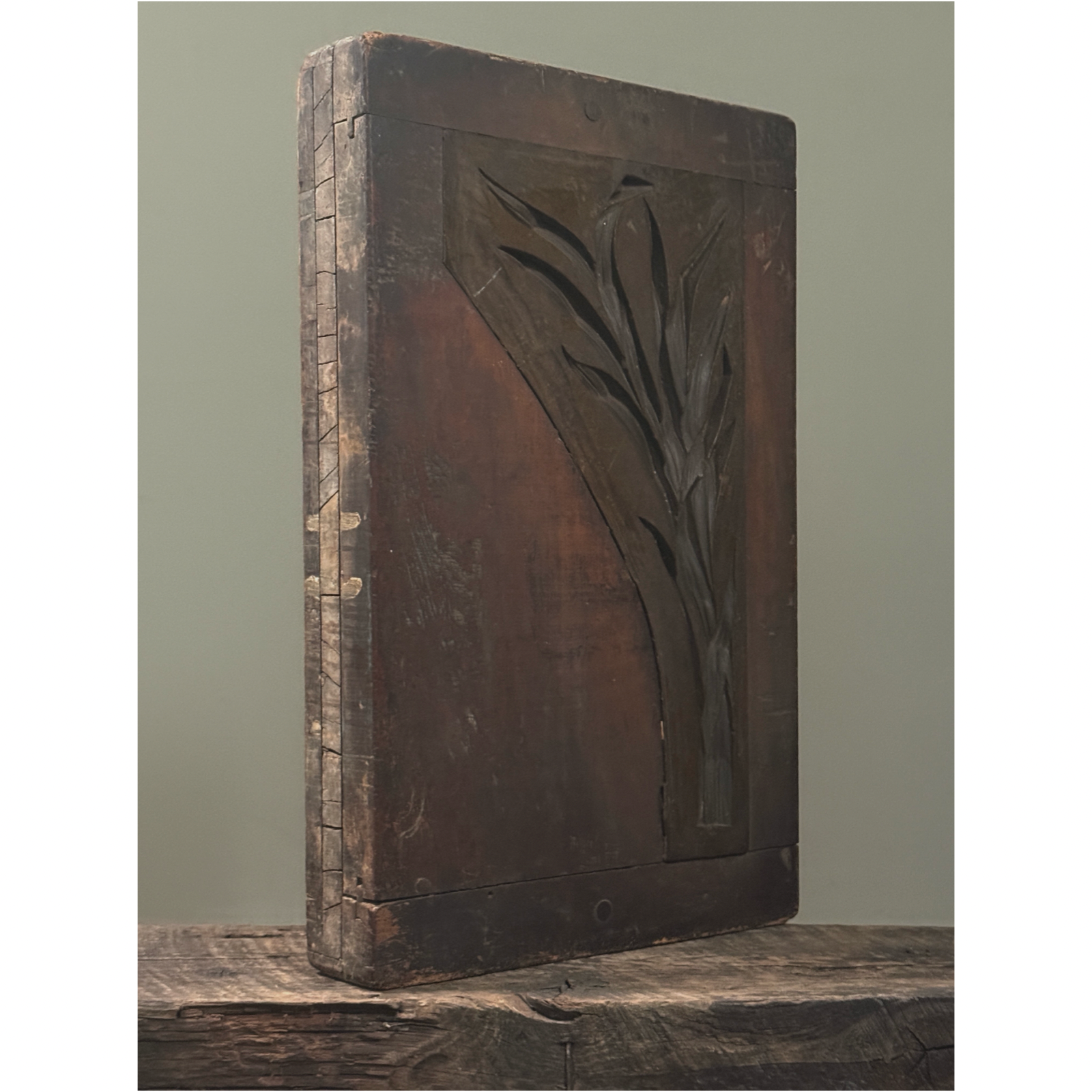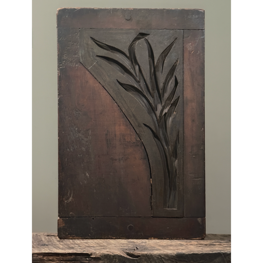 This rare 19th-century neoclassical mold features a stylized botanical motif, possibly representing a blade of grass or plant stalk. The heavy form is constructed from substantial, patinated wooden sections, with a metal plate inset on the front surface—suggesting it may have been used in the production of either dimensional sculpture or bas-relief architectural ornamentation.