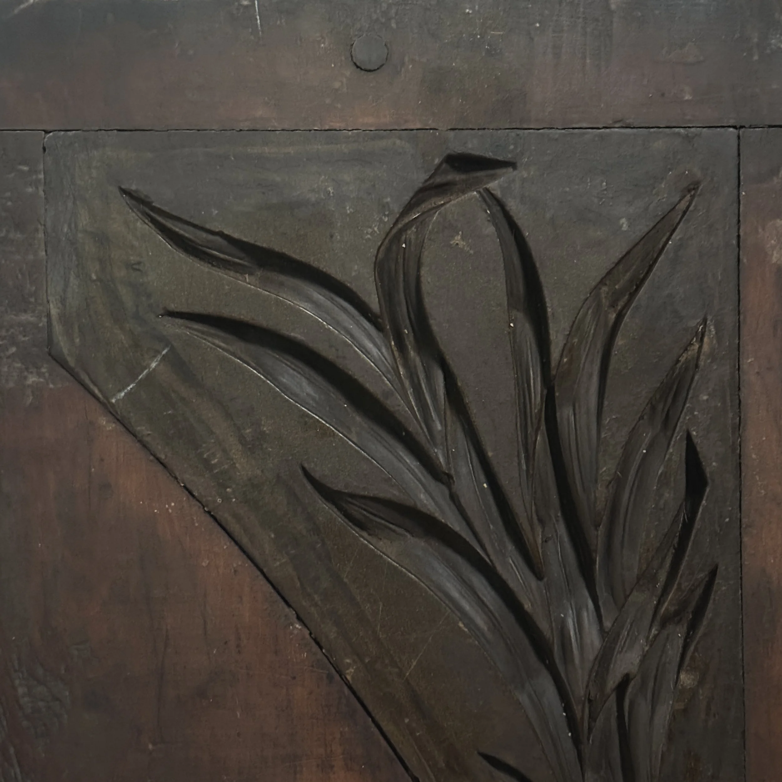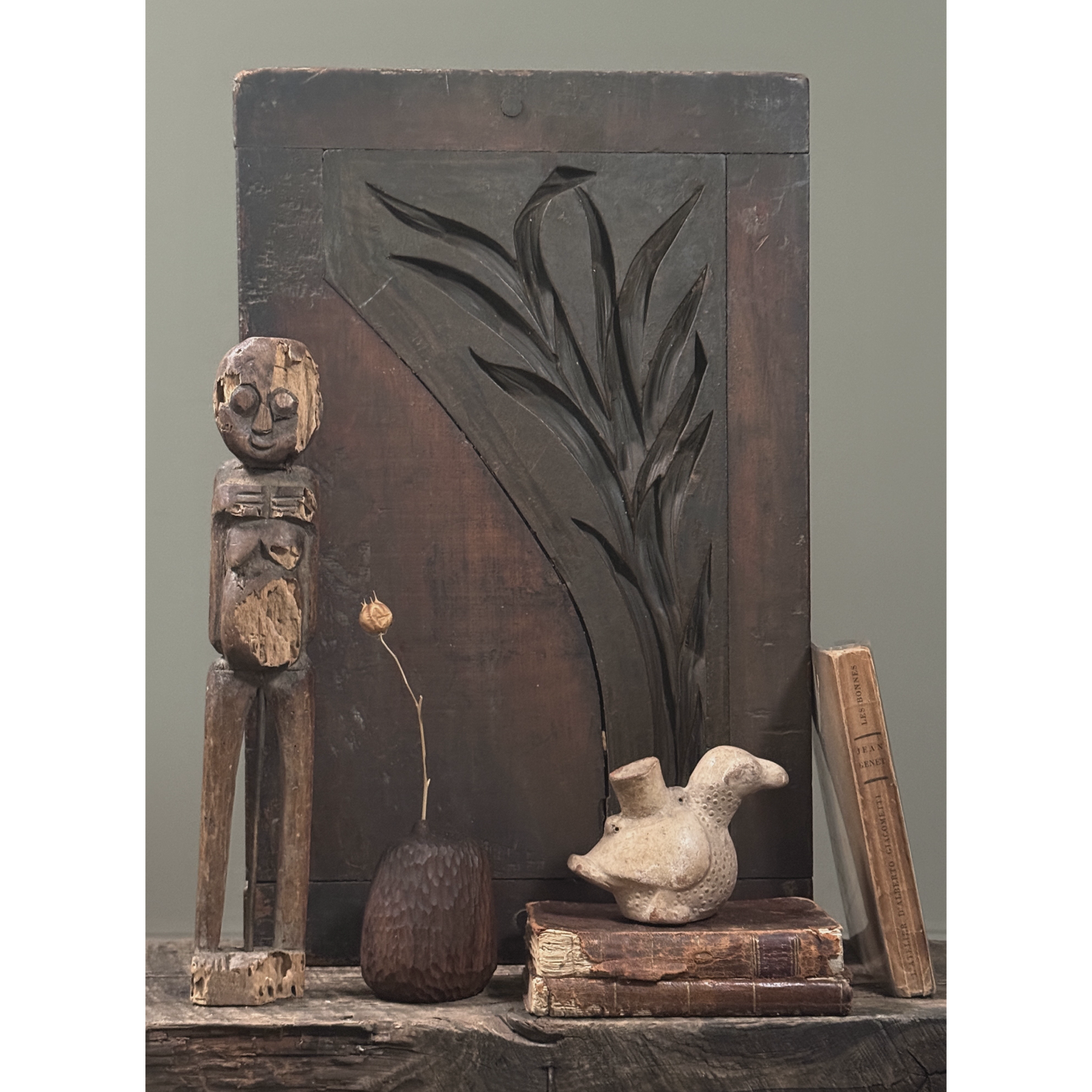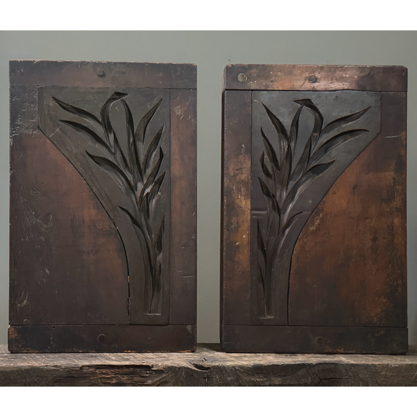 This rare 19th-century neoclassical mold features a stylized botanical motif, possibly representing a blade of grass or plant stalk. The heavy form is constructed from substantial, patinated wooden sections, with a metal plate inset on the front surface—suggesting it may have been used in the production of either dimensional sculpture or bas-relief architectural ornamentation.