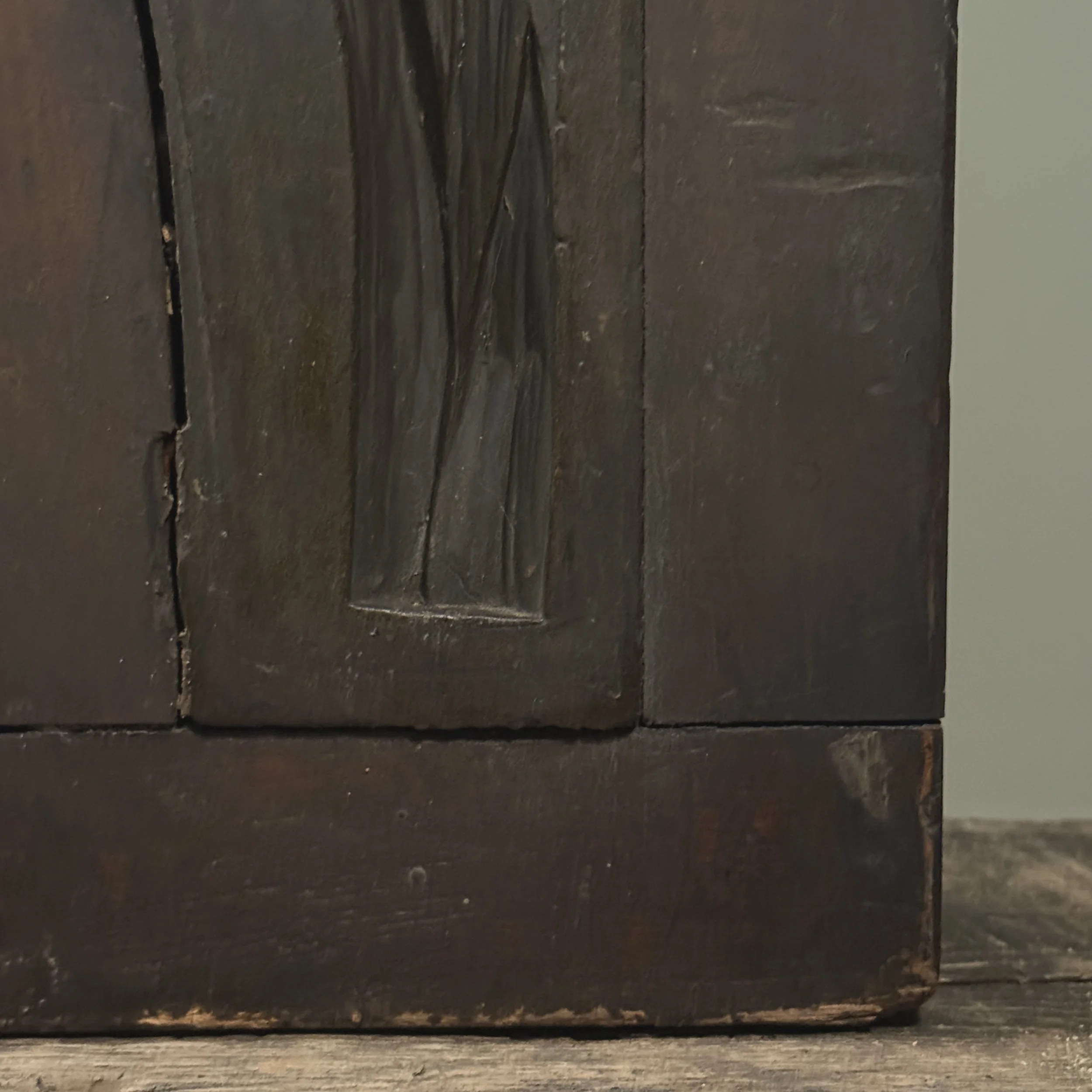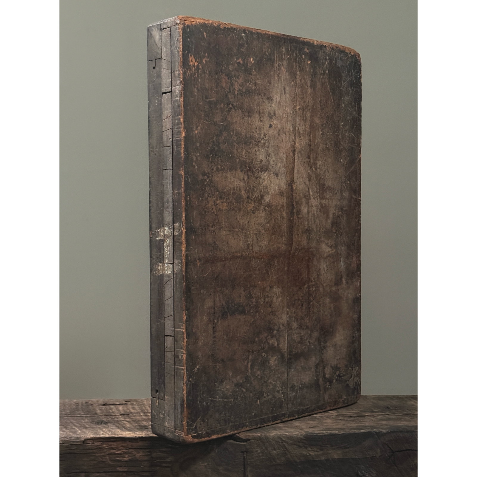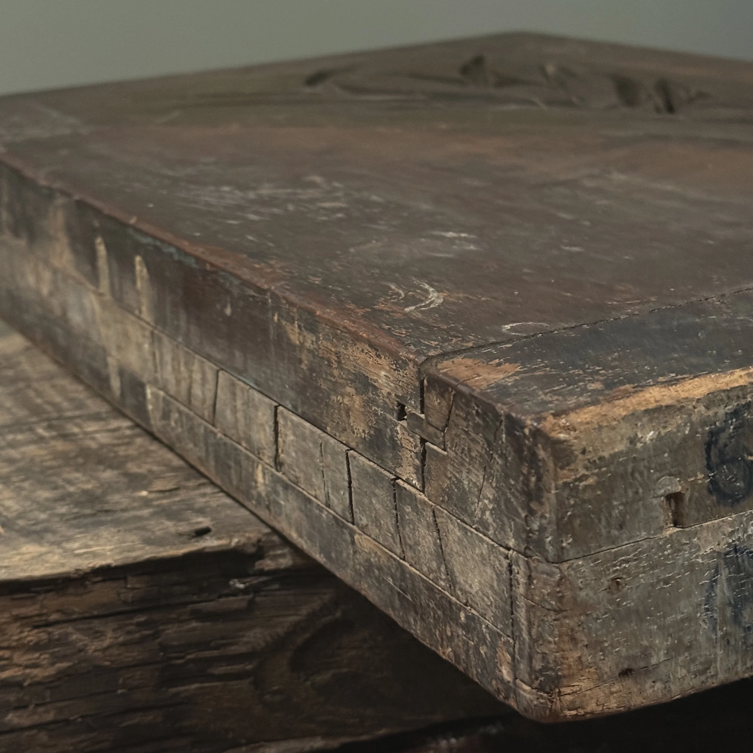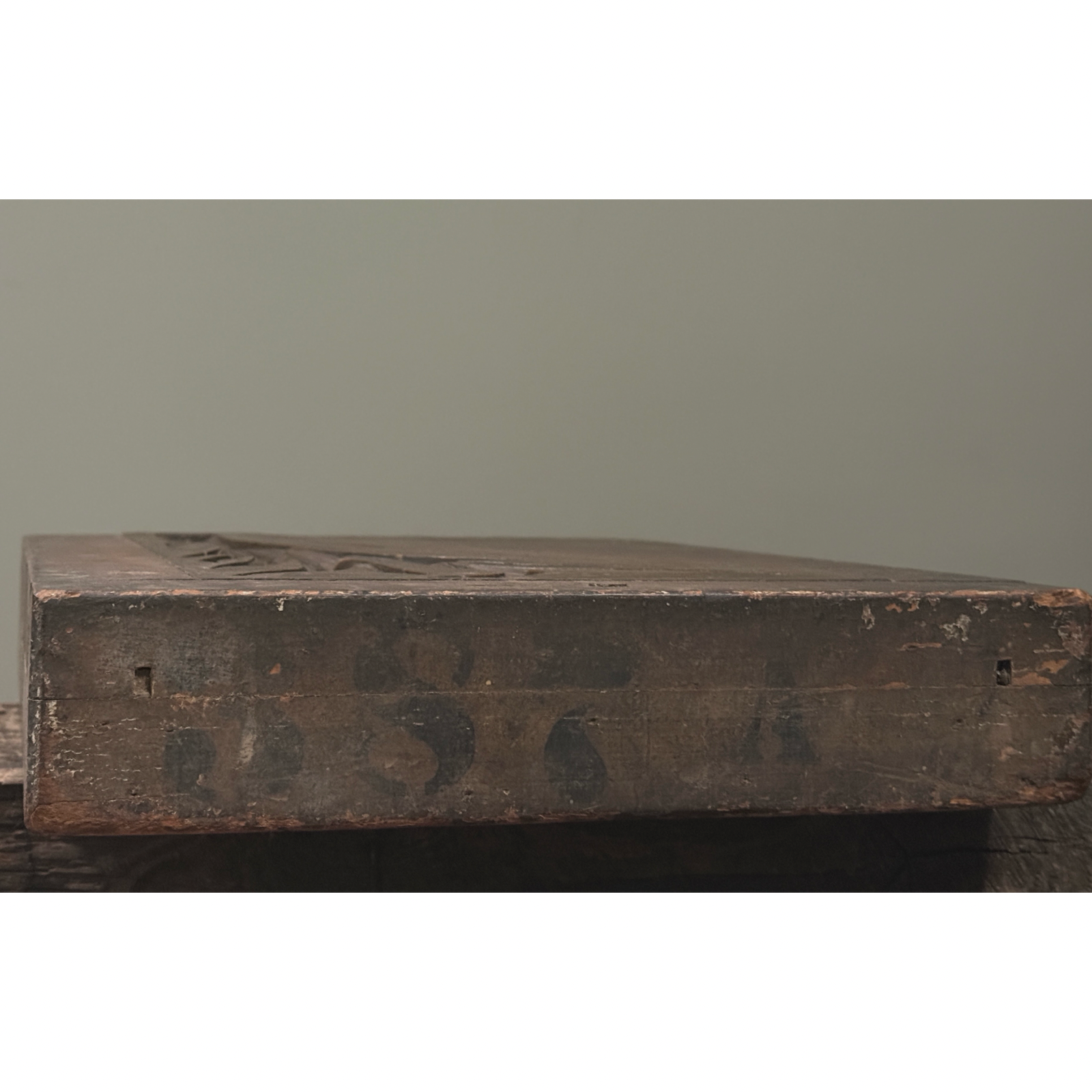 This rare 19th-century neoclassical mold features a stylized botanical motif, possibly representing a blade of grass or plant stalk. The heavy form is constructed from substantial, patinated wooden sections, with a metal plate inset on the front surface—suggesting it may have been used in the production of either dimensional sculpture or bas-relief architectural ornamentation.
