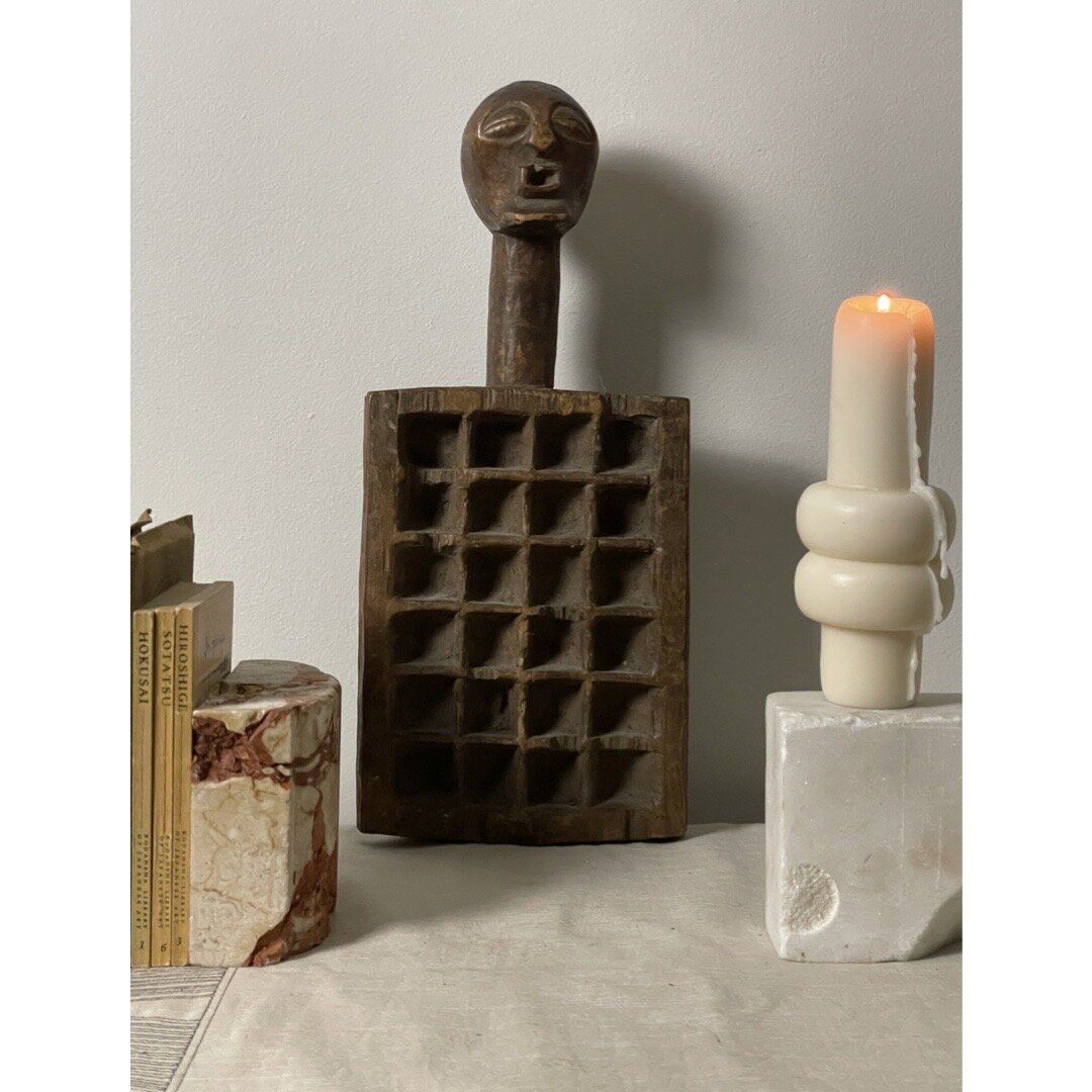 This game board has 24 consoles topped by a watchful face. It wears the expression of surprise or perhaps caution to the winning or losing game partners. This game board has been used quite a bit. Purchased in the Democratic Republic of Congo.