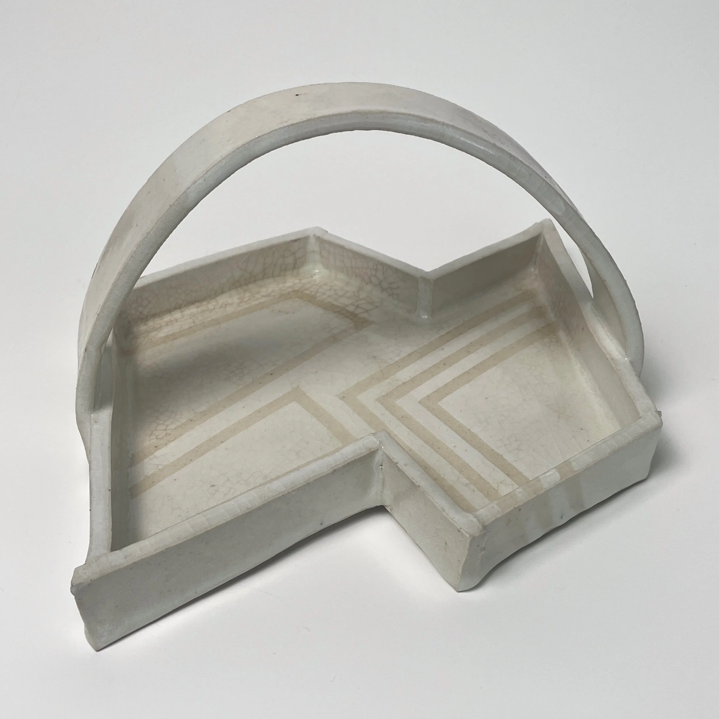 Carole Armstrong (American) Constructivist Studio Art Ceramic Tray, Signed (ca. 1980). Ceramic Tray with handle in white and almond colored stripe detailing. In very good condition with minor wear conducive with age.