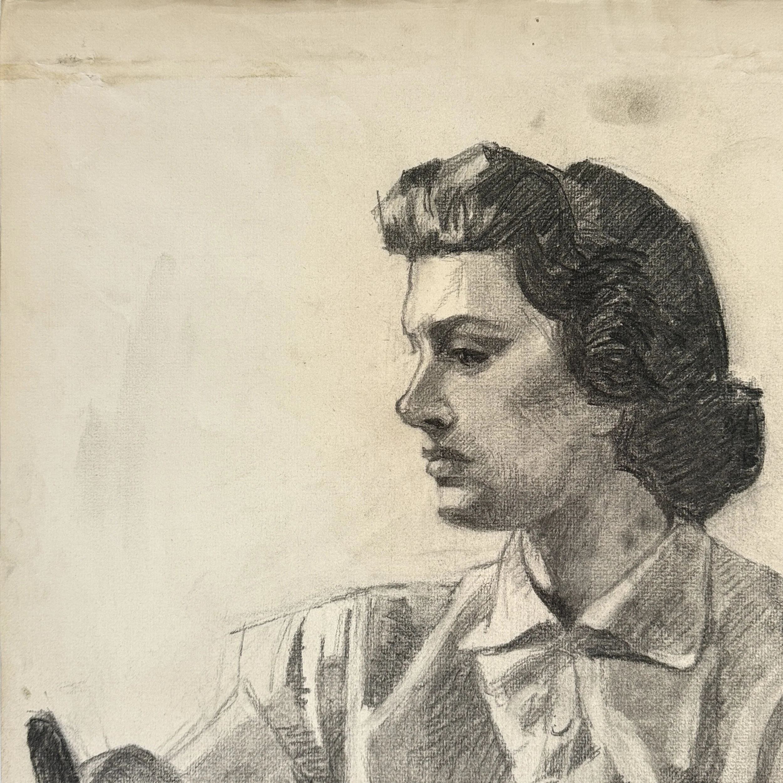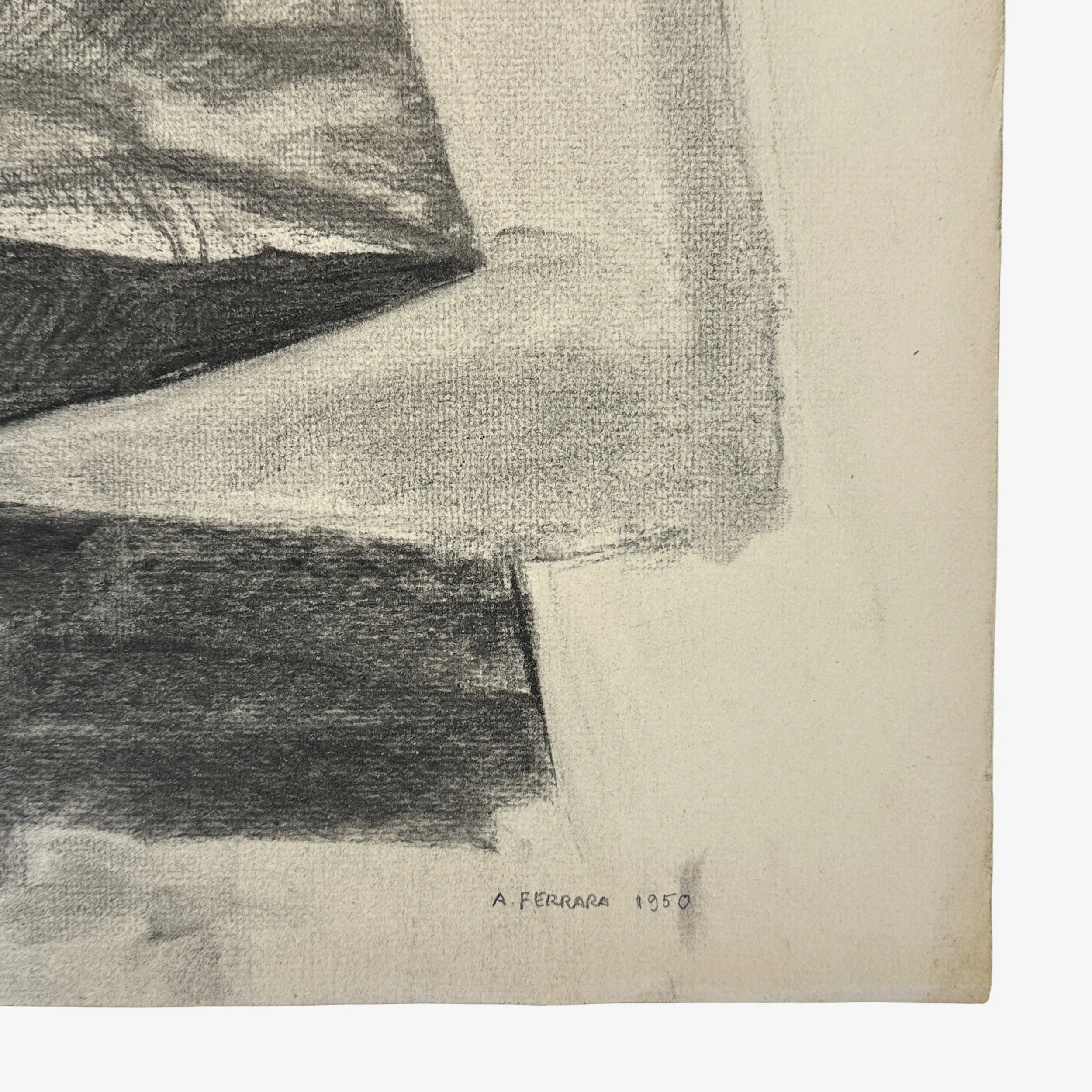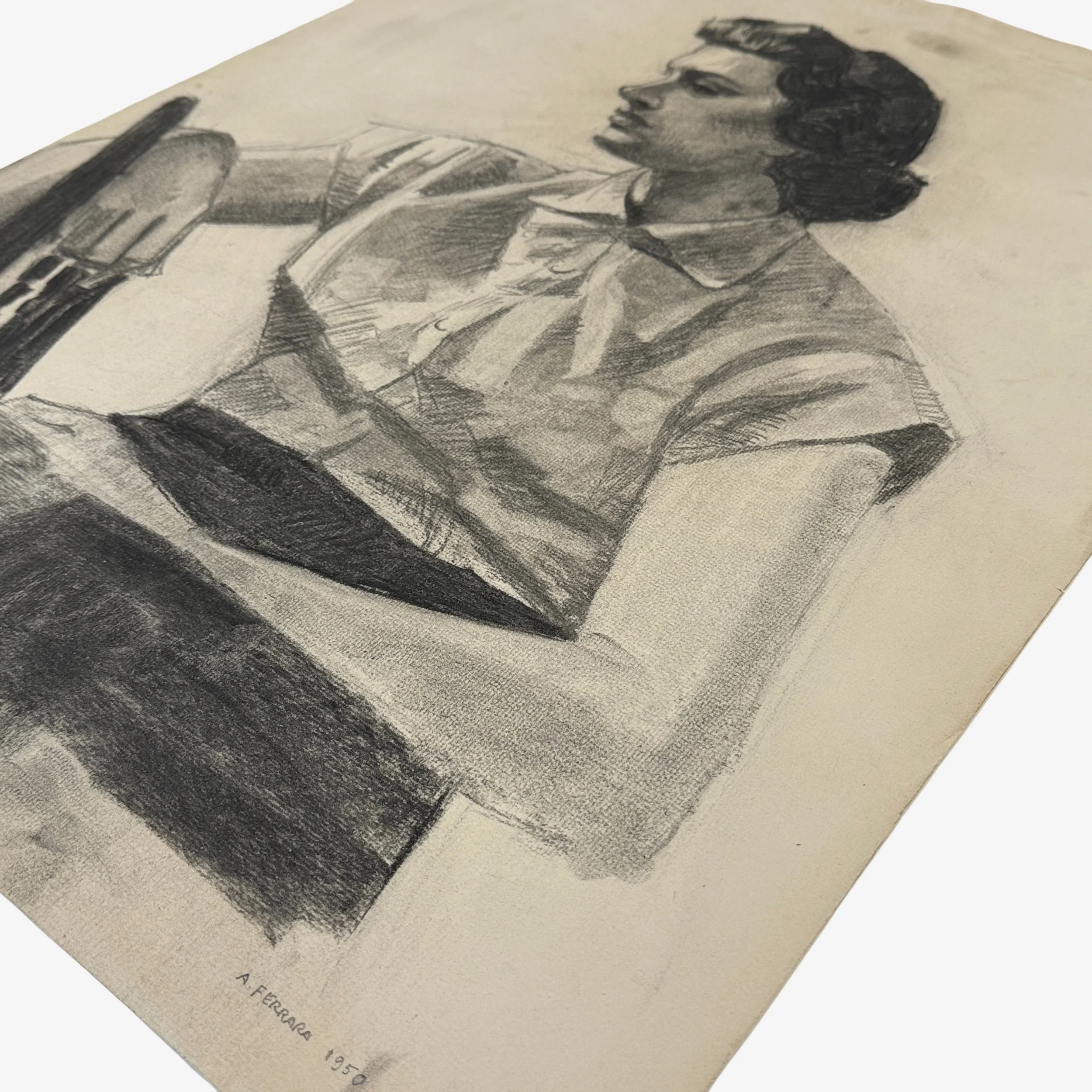 An academic study by American sculptor Donald De Lue, depicting three standing male figures. Executed in charcoal on cream paper. Unframed.