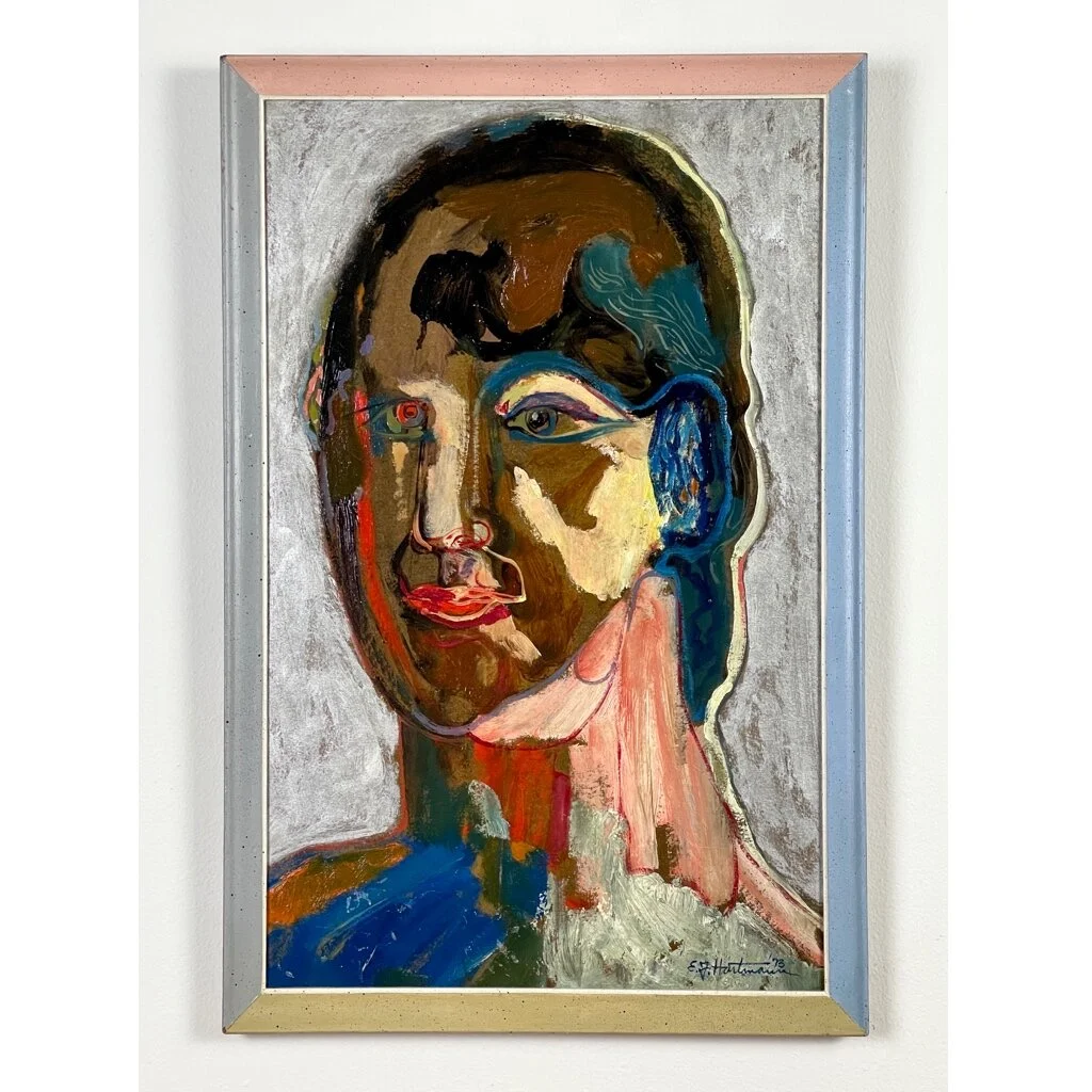 E.J. Hartmann (American, b. 1925) Abstract Portrait on Board (1973, Oil on Board). Abstract portrait on board, signed and dated in the lower right corner. Housed in a hand made frame, painted in 4 different pastel tones. In very good condition with some wear to frame conducive with age.