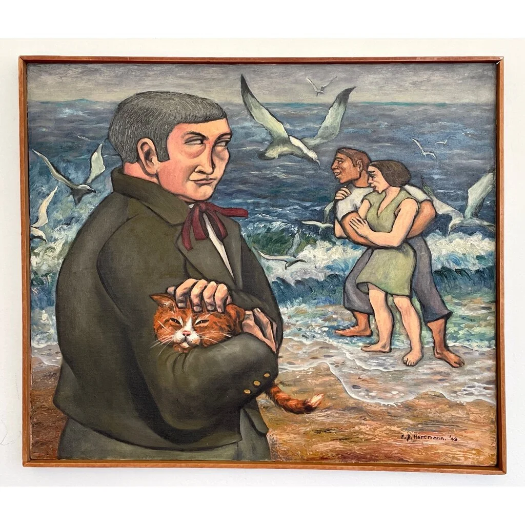 E.J. Hartmann (American, b. 1925) - Untitled Coastal Landscape with Figures (1949, Oil on Canvas). Landscape with Three Figures, one with cat and seagulls. Houses in a wood frame. Signed in the bottom right corner. Condition: canvas in good condition. Frame has wear conducive with age.