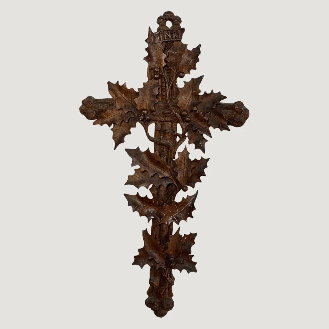 Late 19th Century Folk Art Hand Carved Crucifix.  Carved out of a single piece of wood with holly leaves and berries.  In good condition with some wear conducive with age.  There are a couple of chips along the edge of two leaves.