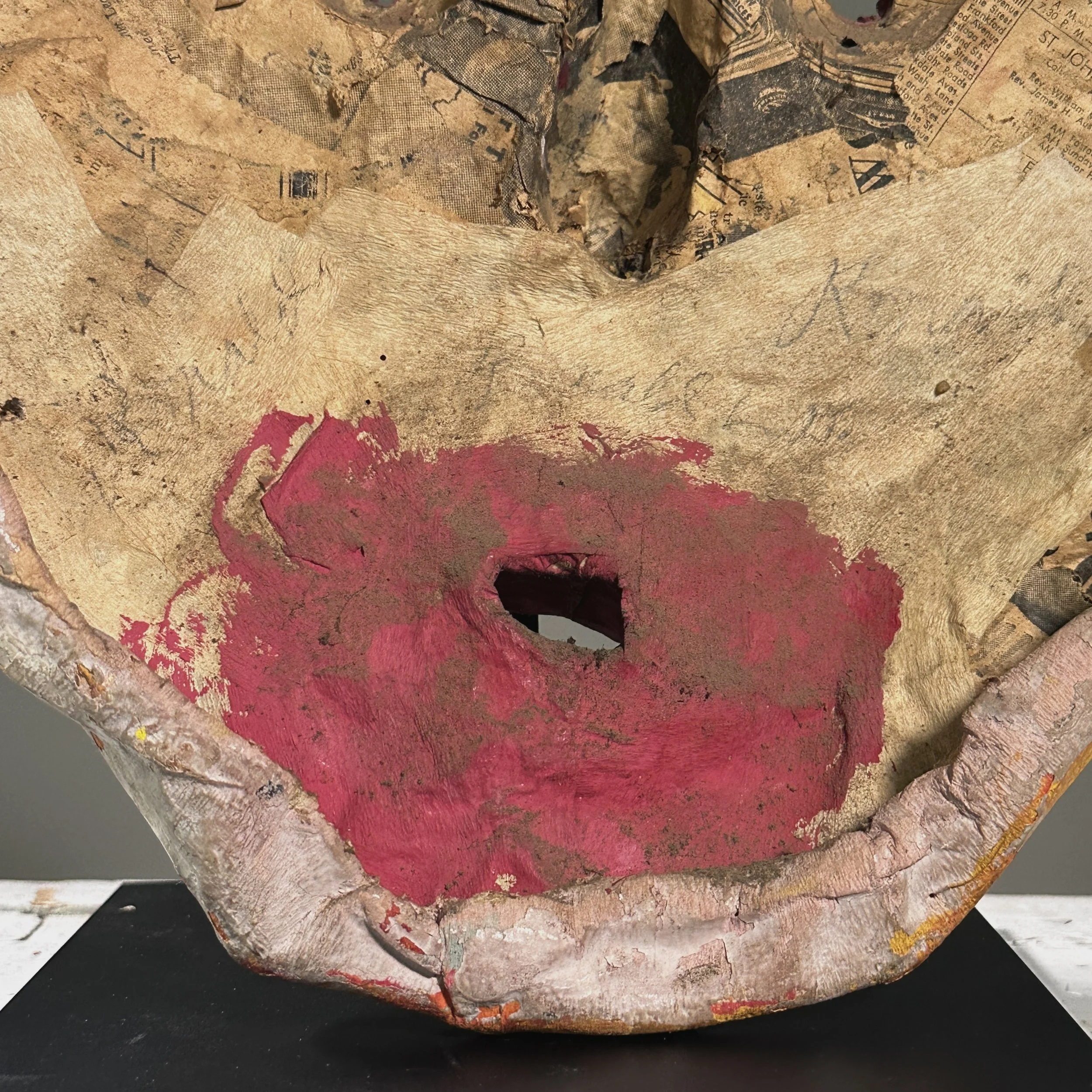Large Vintage Outsider Polychrome Paper Mache Mask. Large clown paper mache mask with a cigarette hanging out of his mouth. Two holes are present in the ears most likely for the string or twine. Illegibly signed in pencil en verso near the mouth opening. In used condition with paint chips and age throughout. The stand is not included.