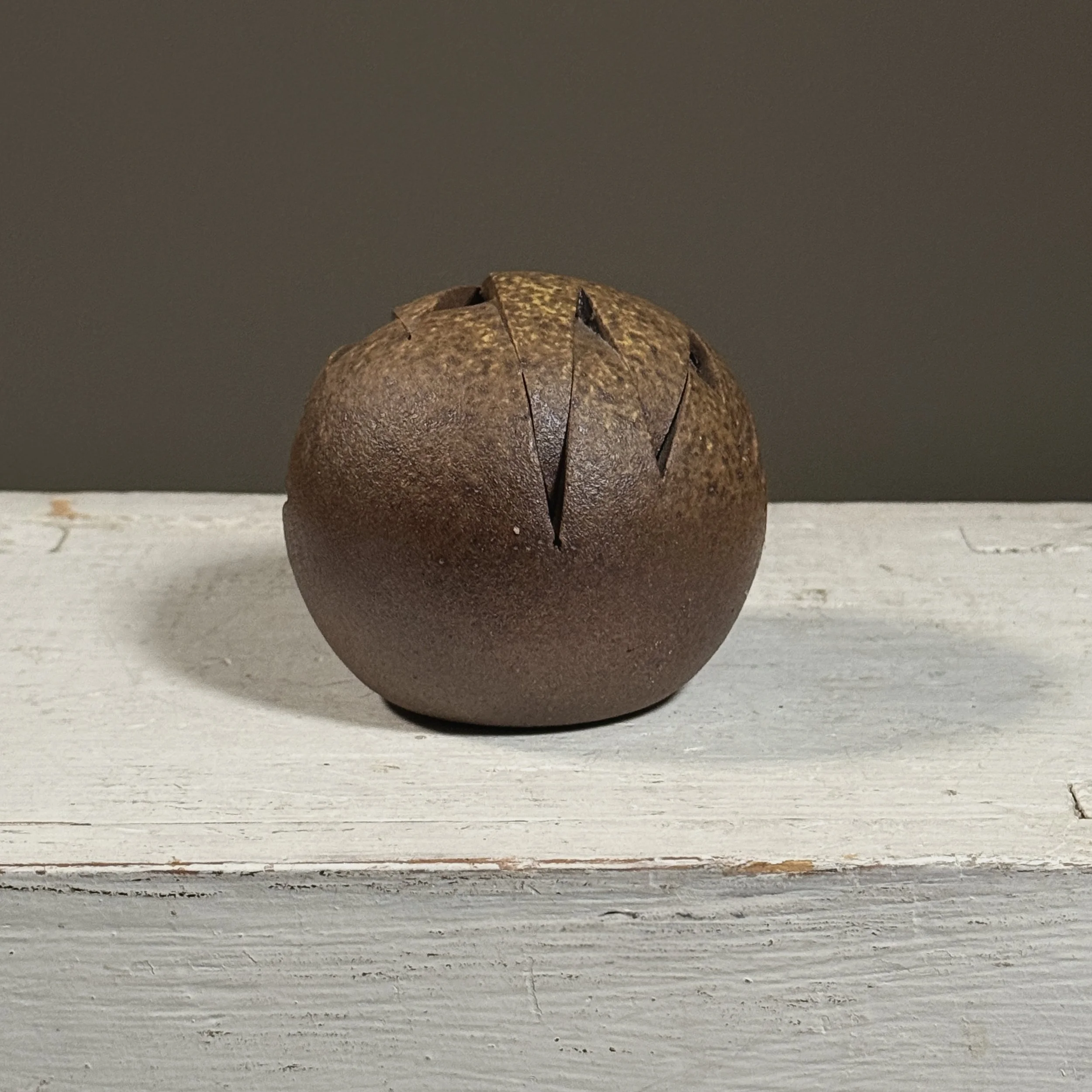 This vintage seed pot is crafted from textured, ruddy colored clay. The vessel bears distinctive smoke markings along its body with subtle traces of white ash deposits. The surface exhibits a natural patina, with wear consistent with age and firing method.