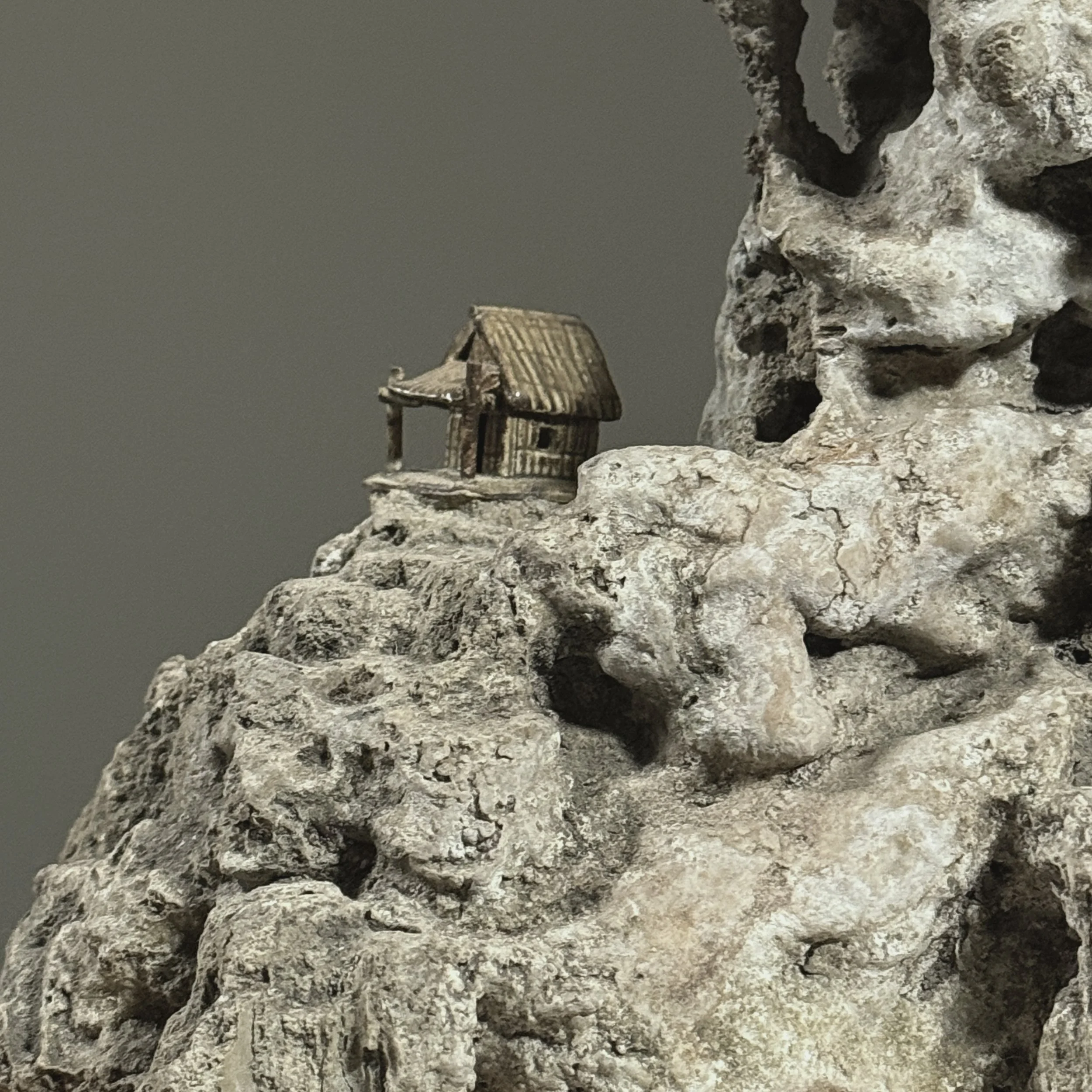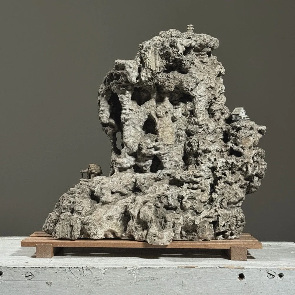 Natural grey stone composition featuring small porcelain houses positioned along the rock’s ledges and contours. The piece exemplifies the Japanese tradition of Suiseki, the art of appreciating naturally formed stones for their aesthetic, symbolic, and meditative qualities. Originating during the Asuka and Nara periods (6th–8th centuries), Suiseki became an important aspect of Japanese garden and display culture, often reflecting miniature landscapes or mountainscapes.