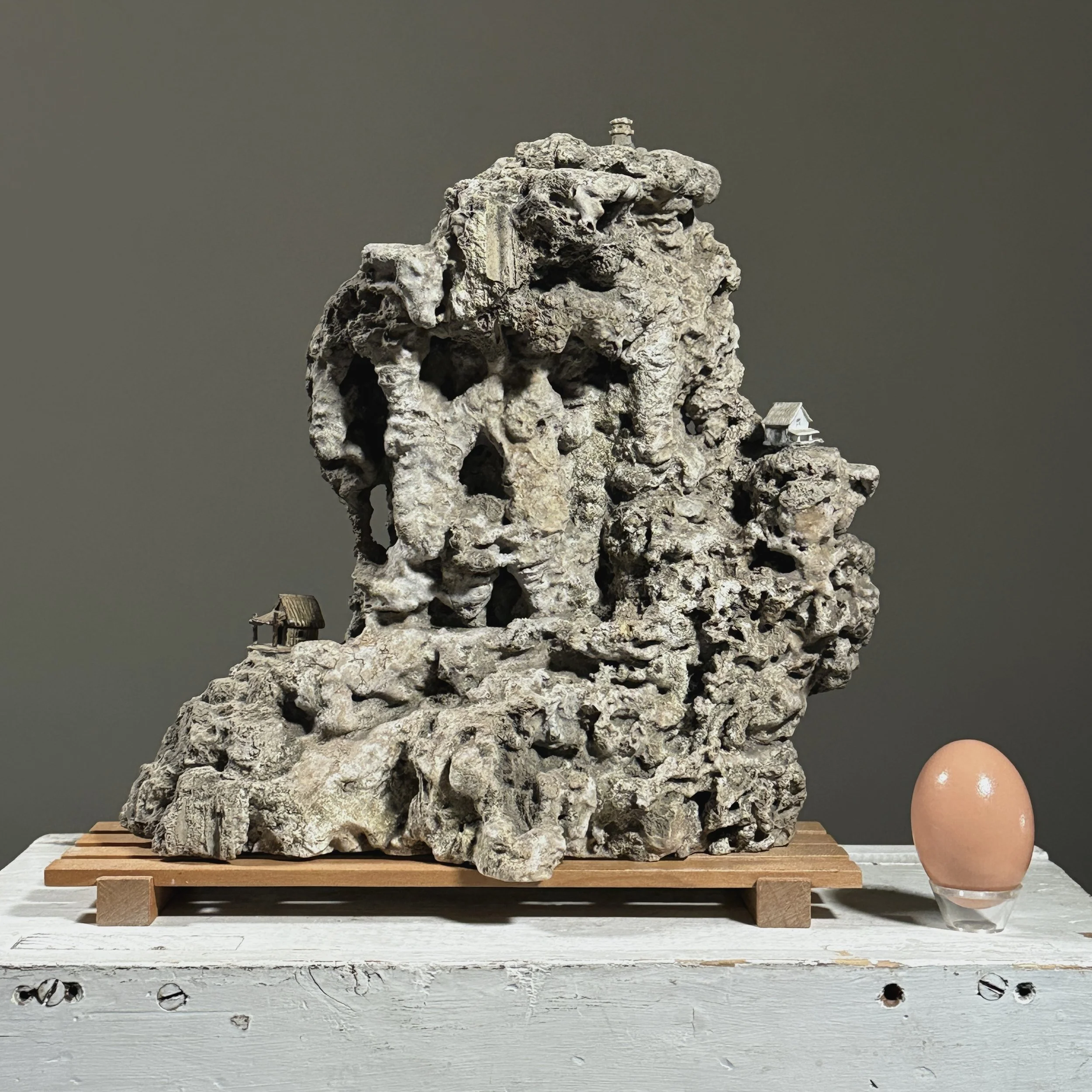 This example integrates architectural elements, suggesting human presence within a natural setting. The sculpture rests on a contemporary wooden slat stand but can also sit directly on a flat surface. In good condition with minor wear consistent with age.