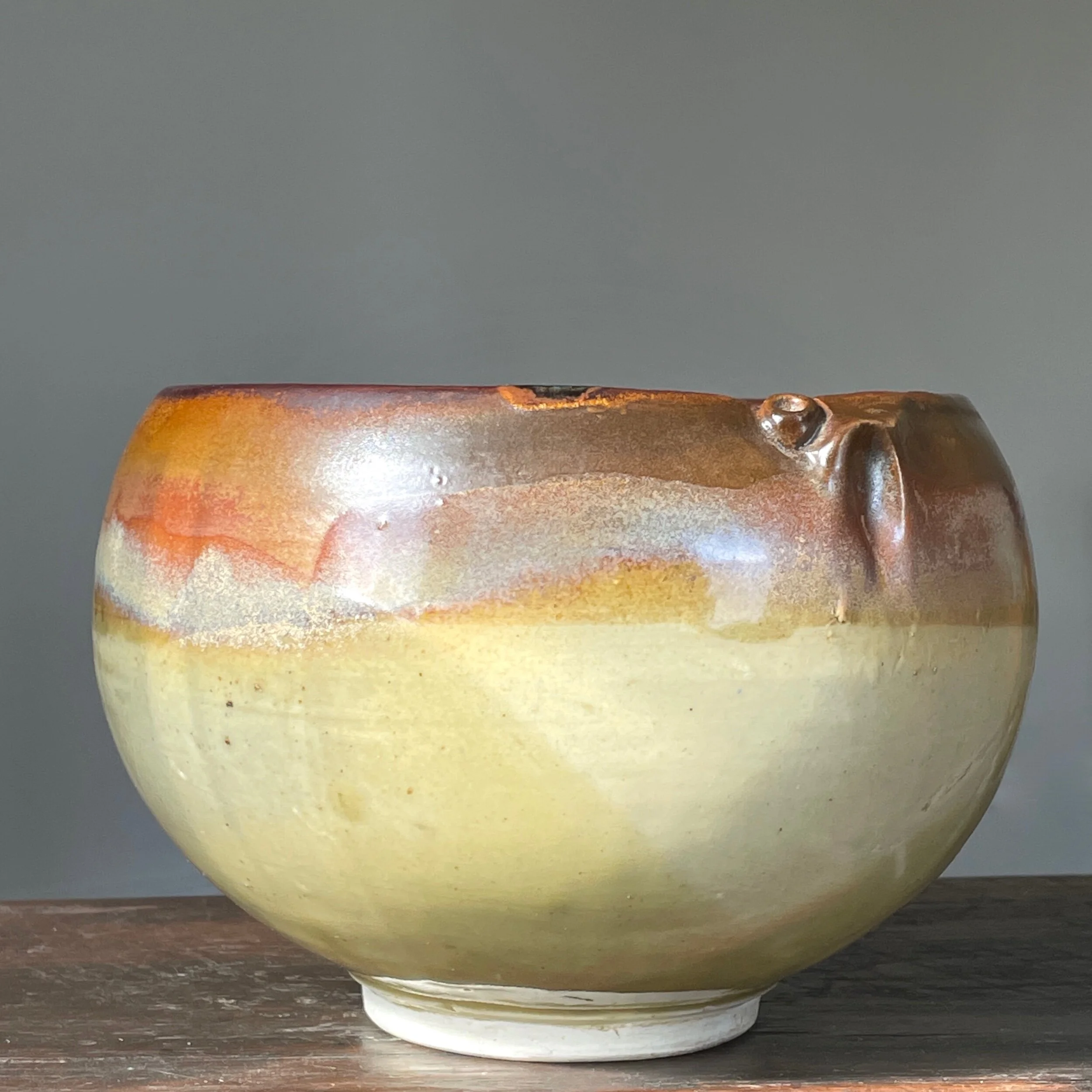 Renzo Faggioli Ombré Glazed Bowl (Signed, ca. 1960). Shades of brown, copper, blue, and beige encase the exterior of the bowl, while the interior is a mottled blue and yellowish beige. Small pinched detail on the rim of the bowl. Signed on the bottom “Renzo”. In good condition with no cracks or chips.