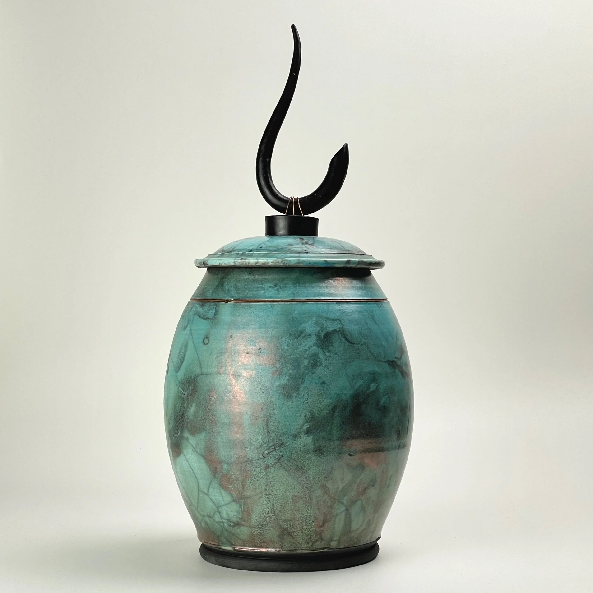 Ron Aubuchon (American, 1947-2014) Lidded Raku Fired Turquoise Glazed Crackle Vessel (Ca. 1990, Signed). Ron Aubuchon iconic carved handled lid. Raku vessel in hues of turquoise, black, and iridescent copper. A copper band is embedded near the rim of the vessel. Signed on the bottom with the Stonehenge Pottery stamp. In good condition with some wear conducive with age. Chip on the side of the lid. Reference photos for details.