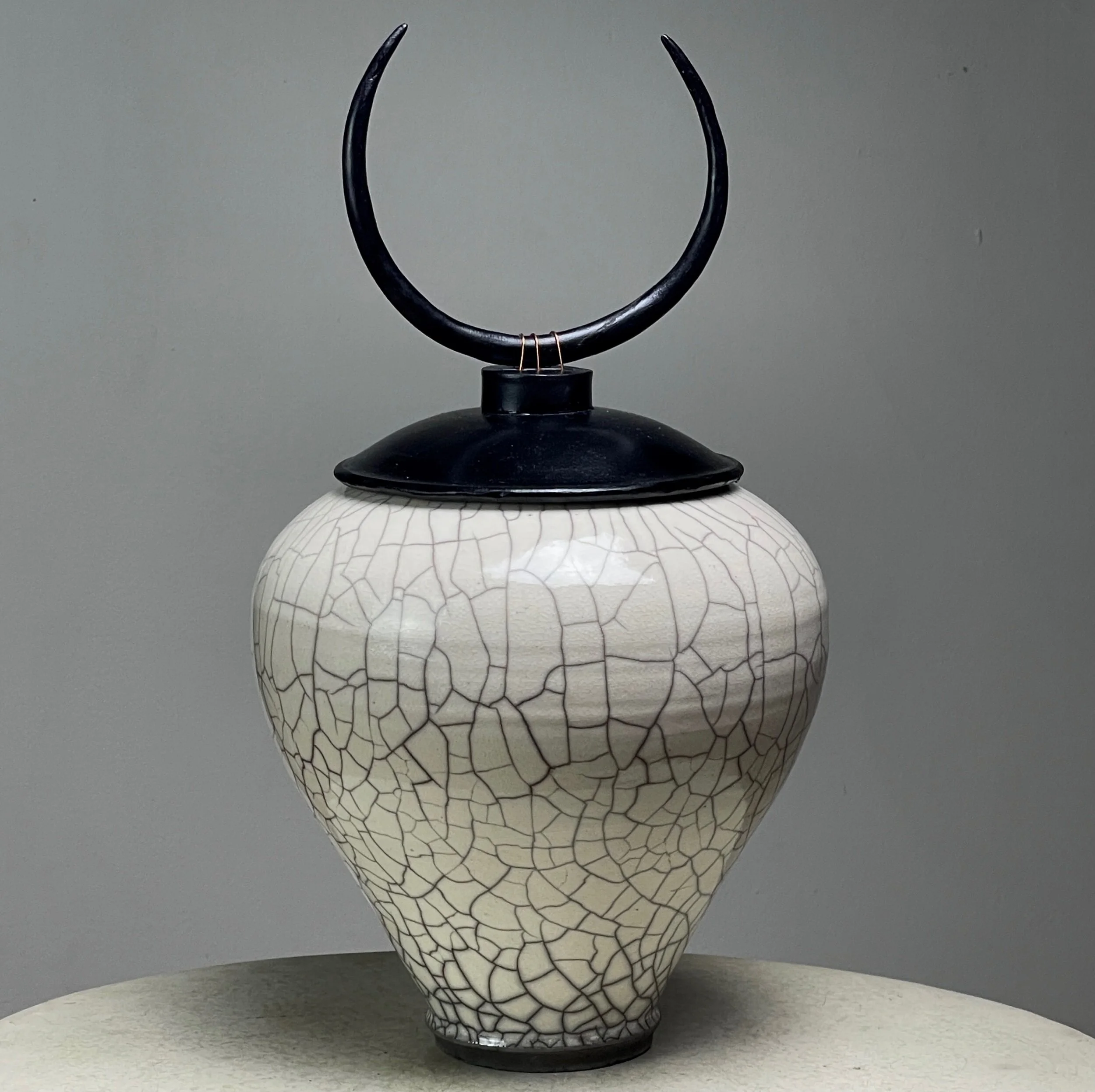 Ron Aubuchon (American, 1947-2014) White Lidded Raku Fired Crackle Vessel (Signed). Raku fired crackle vessel with a crescent shape handled lid. Signed on the bottom with the Stonehenge Pottery stamp. In very good condition with some wear conducive with age.