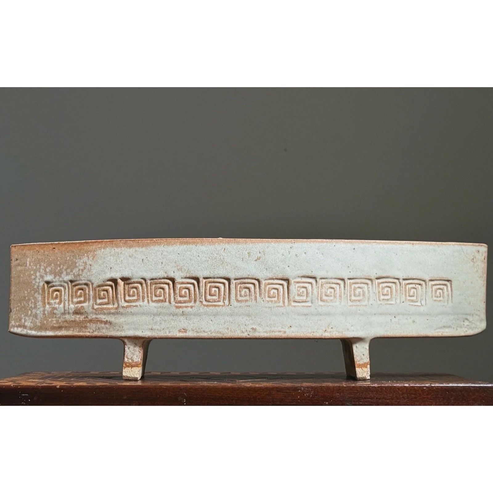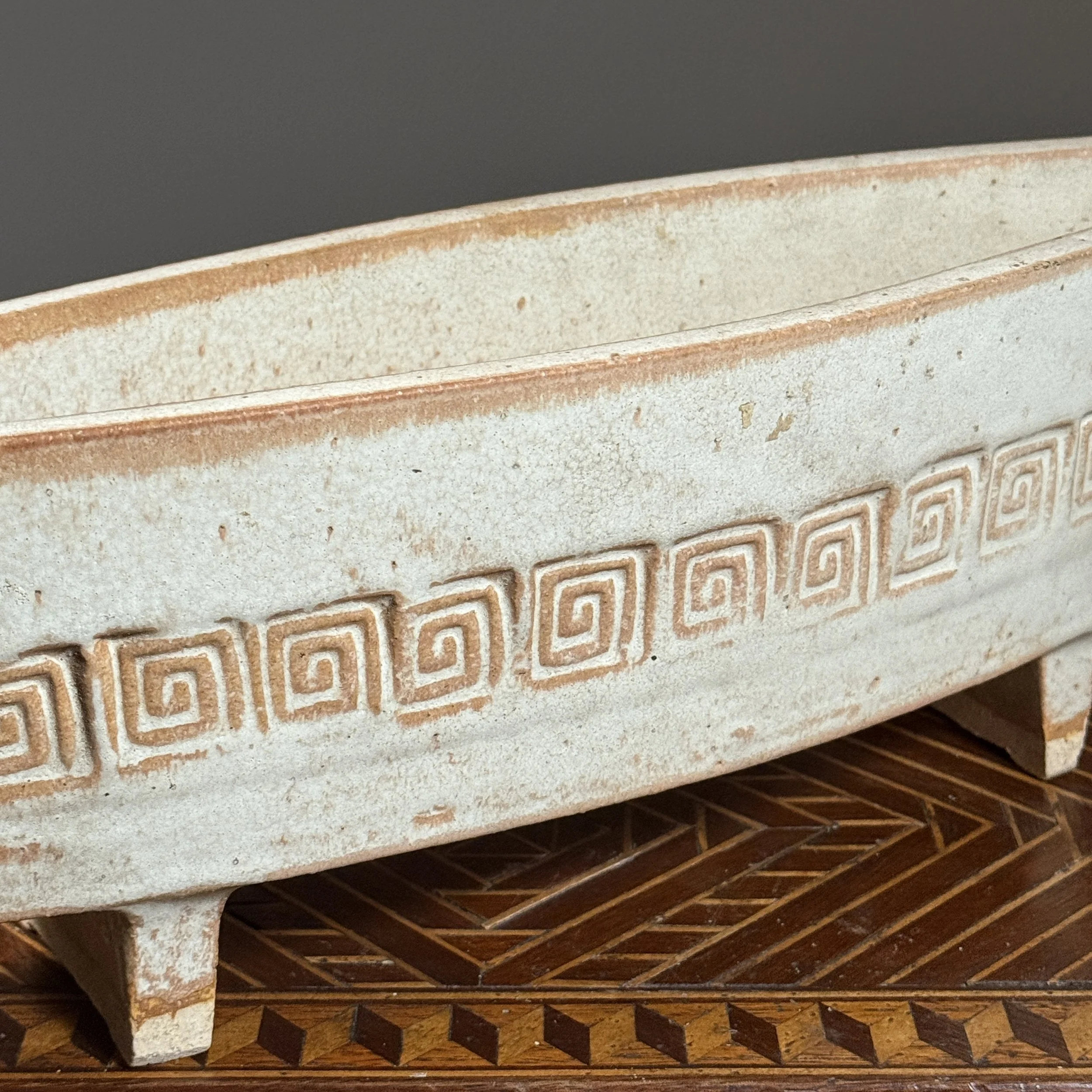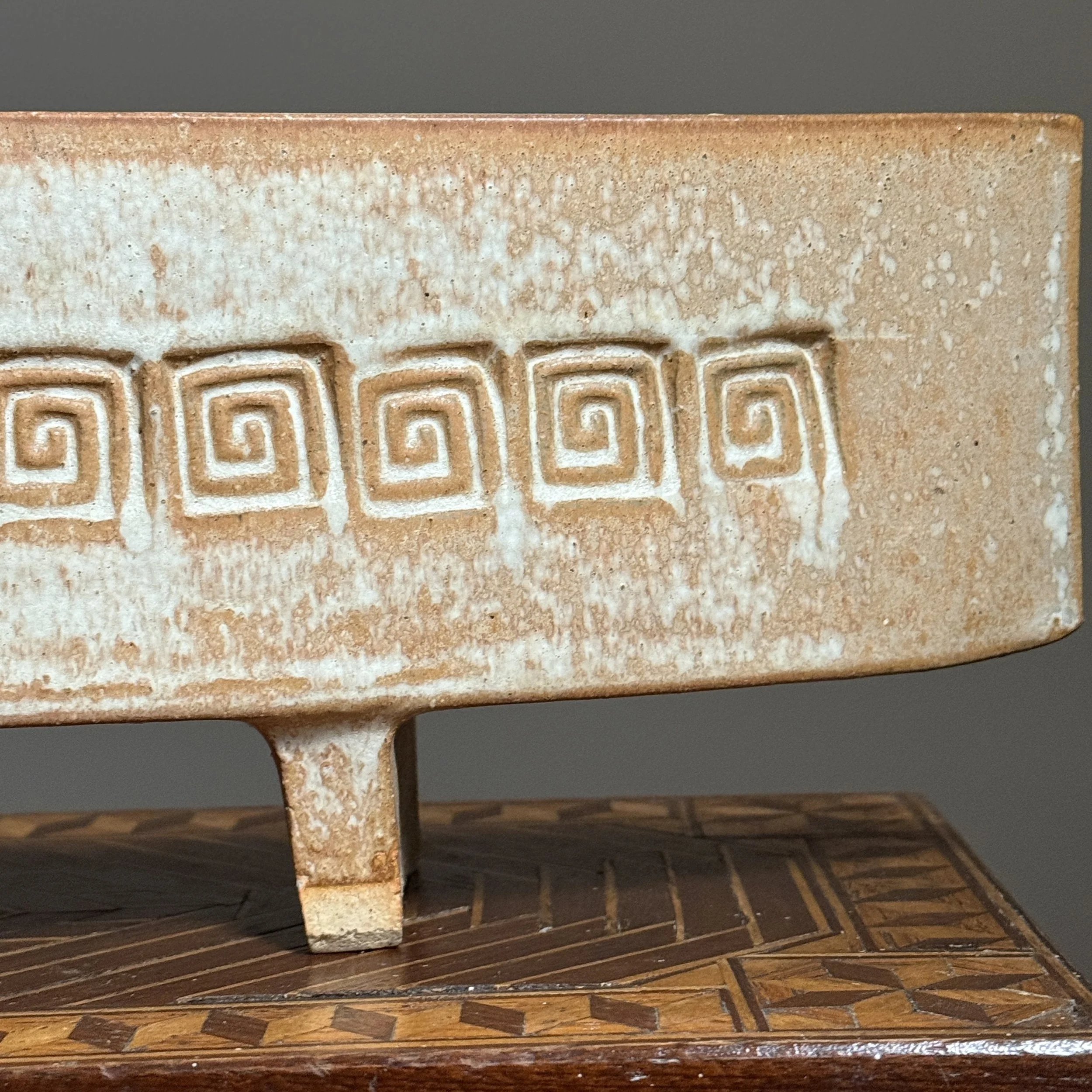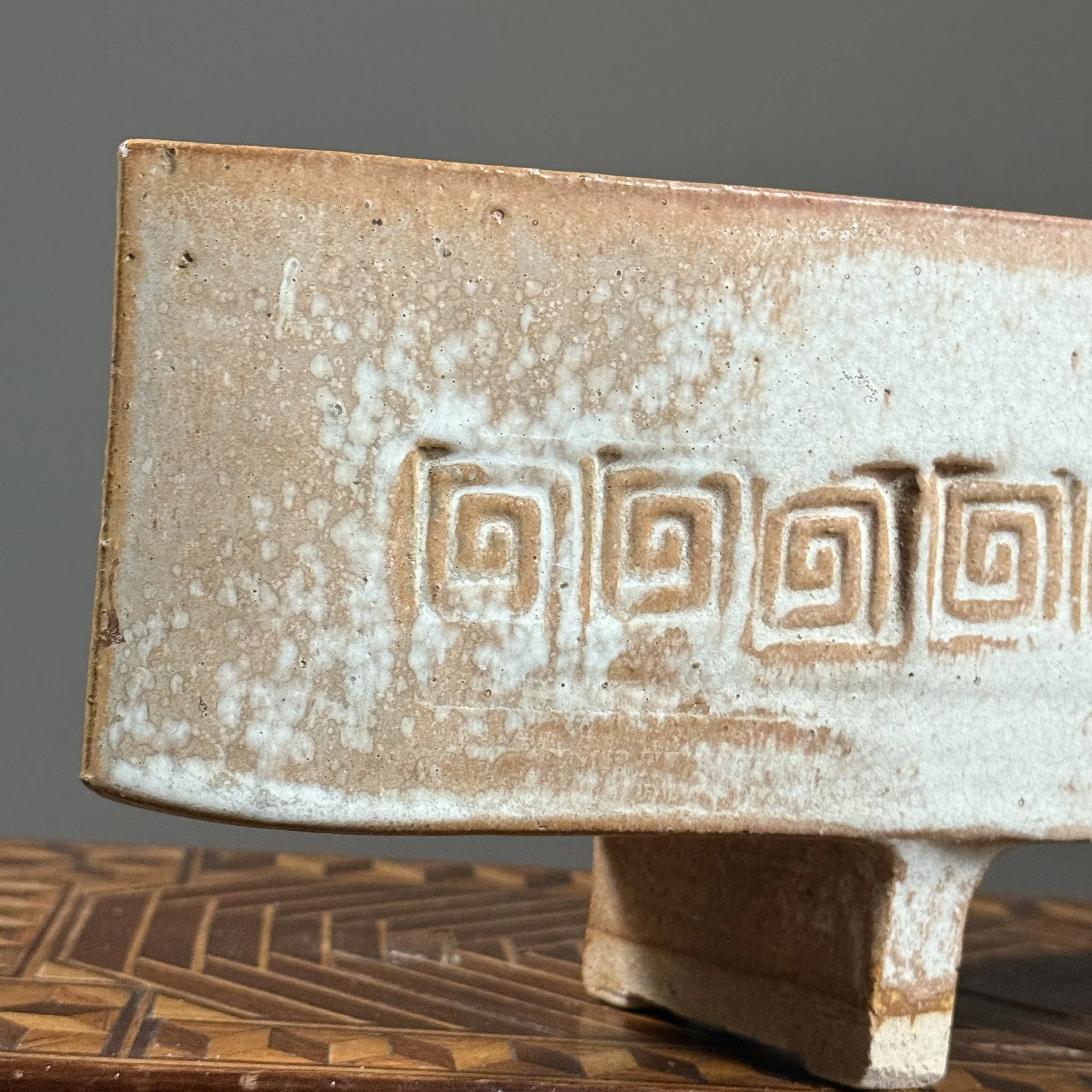 A vintage mid 20th century Japanese ikebana vase with an elongated oval form and block footed base. The vessel features a cream-toned Shino glaze accented by areas of bronze and brown along the rim and edges. A Greek key motif encircles the mid section. The base bears the impressed signature of the artist. In good condition with wear consistent with age and use.