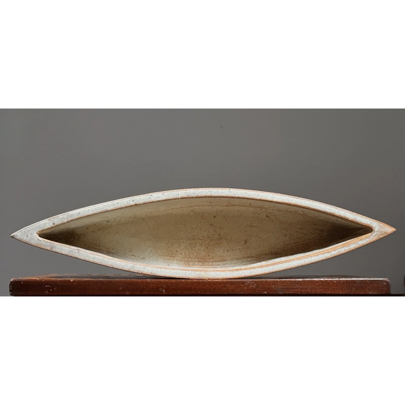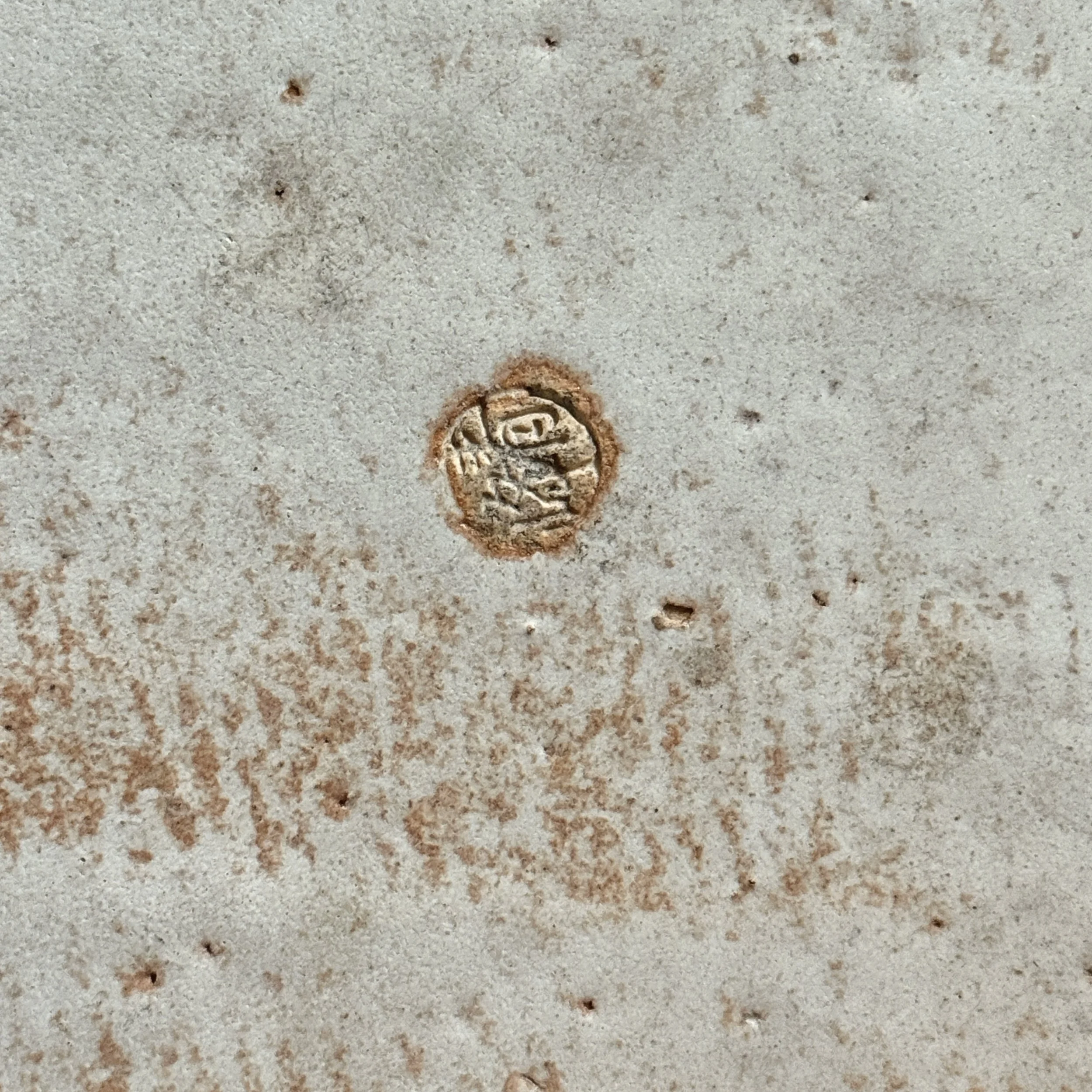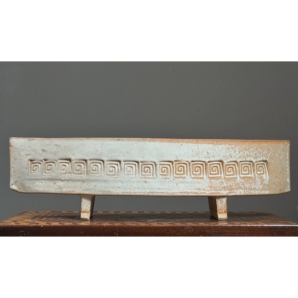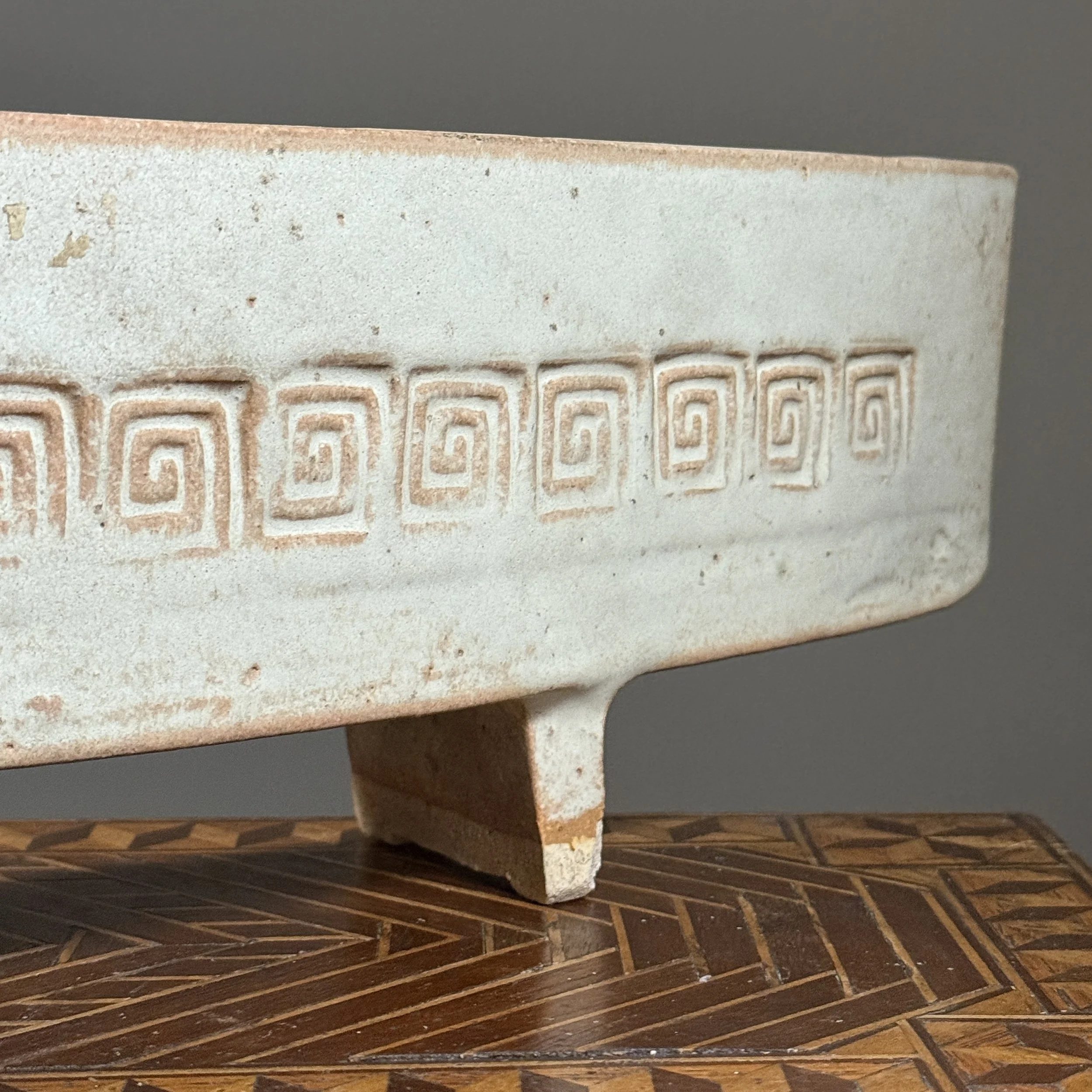 A vintage mid 20th century Japanese ikebana vase with an elongated oval form and block footed base. The vessel features a cream-toned Shino glaze accented by areas of bronze and brown along the rim and edges. A Greek key motif encircles the mid section. The base bears the impressed signature of the artist. In good condition with wear consistent with age and use.